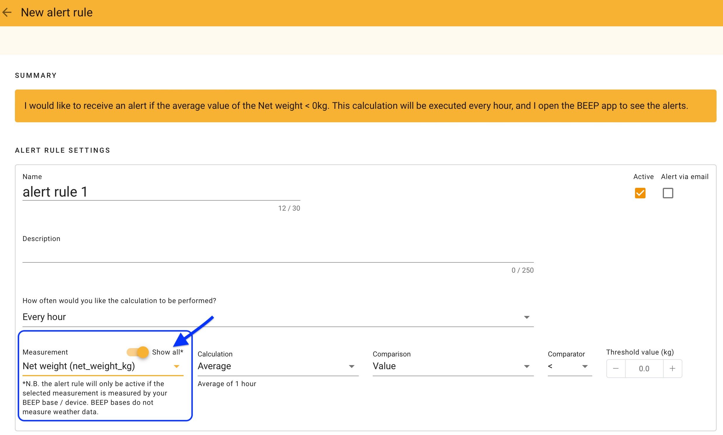 It is possible to set an alert based on the net weight of your hive. Follow these instructions: