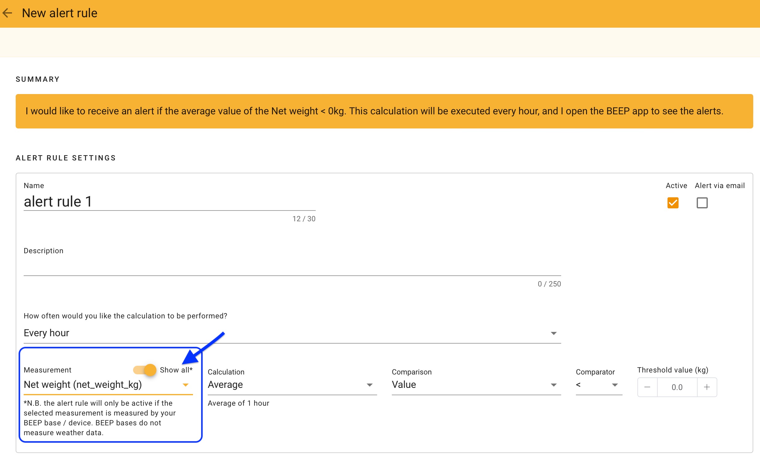 Het is mogelijk om een notificatie in te stellen op basis van het netto gewicht van jouw bijenkast. Volg deze instructies: