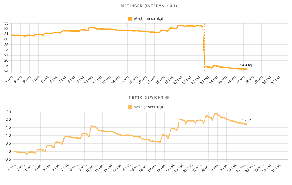 Boven: bovenaan het absolute gewicht over de periode van een maand. Bij de voorjaarsinspectie is een kastdeel verwijderd. De gestippelde rode lijn geeft aan dat er een inspectie is ingevoerd in de BEEP-app. In de onderste grafiek het nettogewicht: enkel de verandering vanaf het begin van de maand. In de app kun je instellen welk tijdsbestek je wilt zien: week, dag, uur. Omdat de inspectie ingevoerd was, filtert een algoritme automatisch de gewichtswijziging door toedoen van de imker eruit!