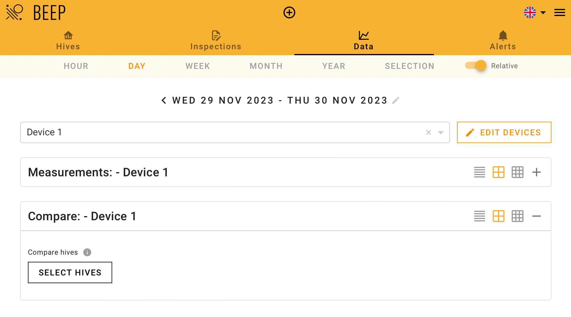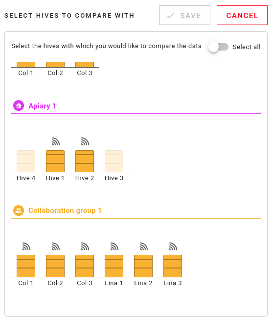 - Ga naar de Gegevens pagina en selecteer de bijenkast waarmee je wilt vergelijken.