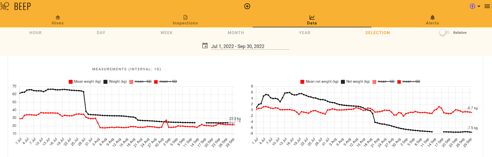Nadat je de bijenkasten hebt geselecteerd, worden twee grafieken getoond: