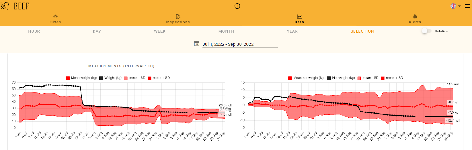 Toont ruwe gewichtsgegevens van je kolonie en het gemiddelde gewicht van alle geselecteerde bijenkasten. | Toont netto gewichtsgegevens van je bijenkast van interesse en het gemiddelde nettogewicht van alle geselecteerde bijenkasten. |